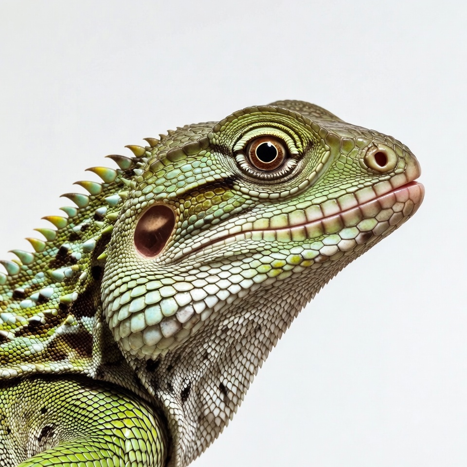 animal, close-up, exotic pet, green iguana, lizard, orange eye, portrait, reptile, scales, spiky dewlap, white background, wildlife, iguana
