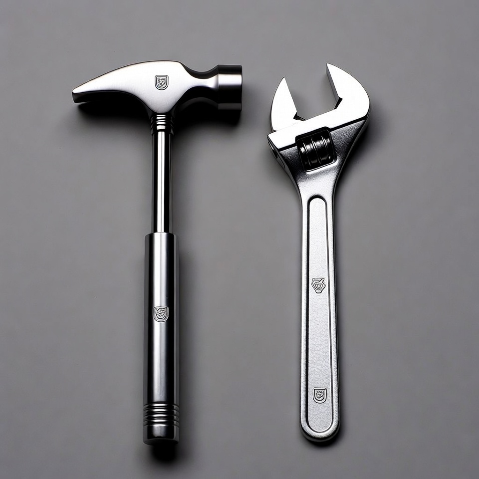 A shiny silver claw hammer with a curved head and wooden-handled grip lies beside a large adjustable wrench on a plain gray background. Both tools feature a distinctive shield logo on their metallic surfaces. They are positioned parallel, highlighting their clean, polished finishes.