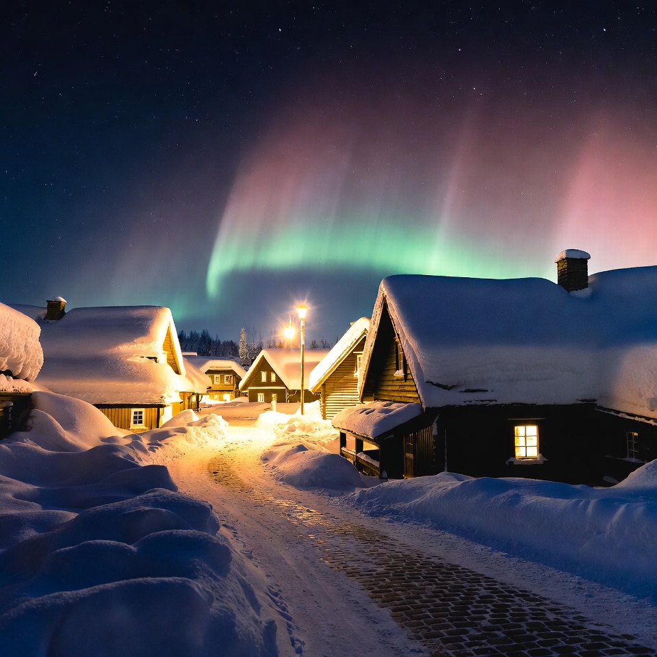arctic landscape, cold weather, green aurora, heavy snow, illuminated snow, night sky, northern lights, purple aurora, rural village, snow covered cabins, snow path, snowy village, starry sky, street lamp, winter night, wooden houses, aurora borealis