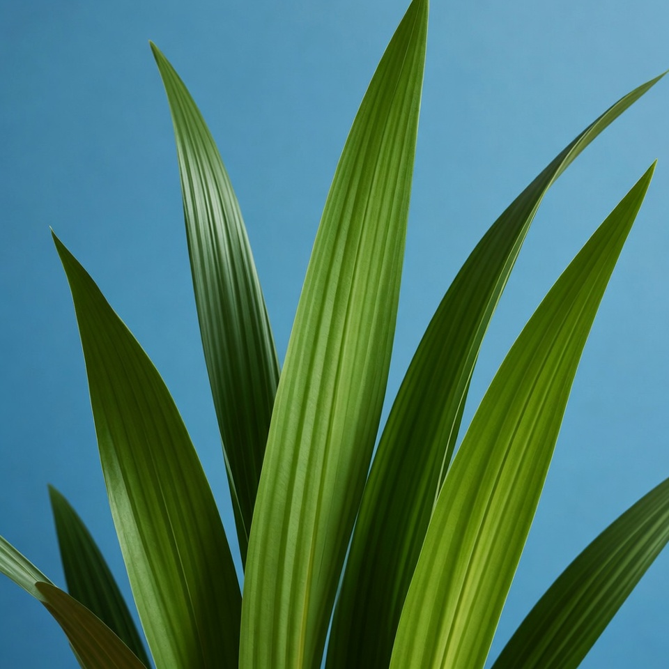 Vibrant green leaves with pointed tips and prominent veins stand out sharply against a solid blue background. The leaves fan outwards from the center, displaying smooth, glossy surfaces. The isolated composition highlights the plant's fresh, lush foliage.