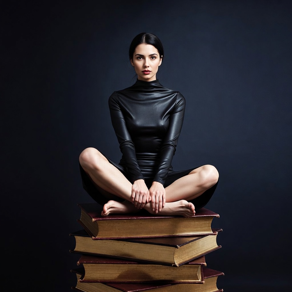 A beautiful woman with long dark hair sits cross-legged atop a tall stack of large antique books. She wears a shiny black leather dress with a turtleneck and gazes directly at the viewer. Her bare feet rest on the books with hands clasped in her lap against a dark background.