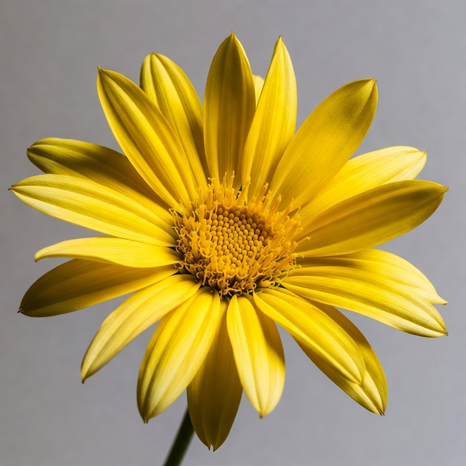 A vibrant yellow gerbera daisy flower with bright petals radiating from a fuzzy orange center is isolated on a plain gray background. The petals are smooth and slightly curved, giving the flower a dynamic appearance. A thin green stem supports the bloom.