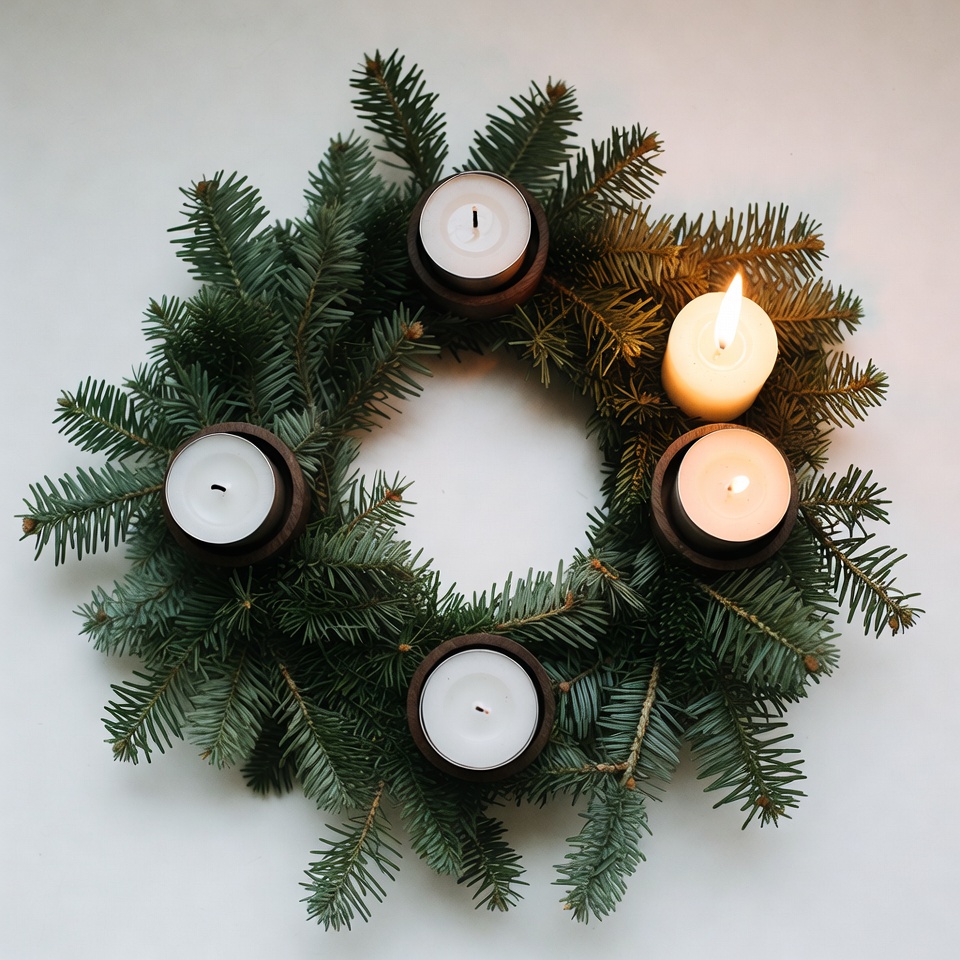 A circular Advent wreath made of lush green fir branches sits on a white surface. Four dark candle holders with white candles are evenly spaced around the wreath, with one candle lit and glowing brightly. The arrangement is viewed from above against a plain white background.