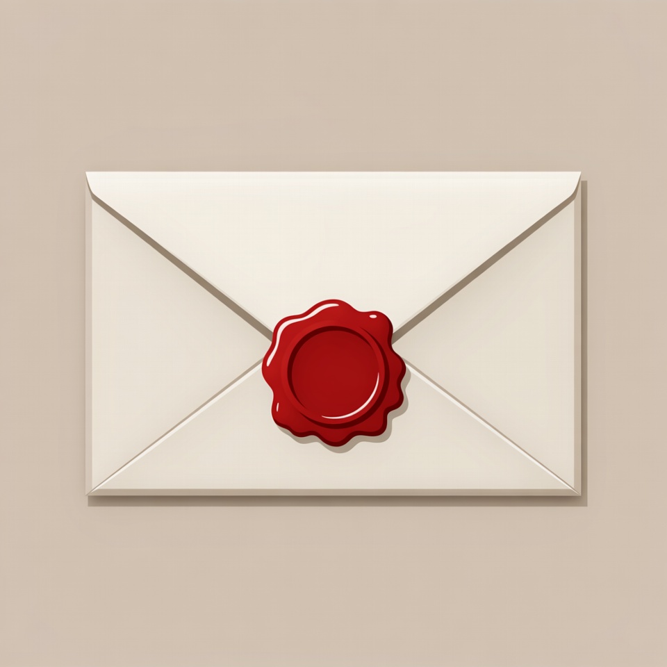 A white envelope with a flap is sealed with a red wax seal on a beige background. The wax seal is prominently centered on the envelope's flap. The image is a clean vector illustration.
