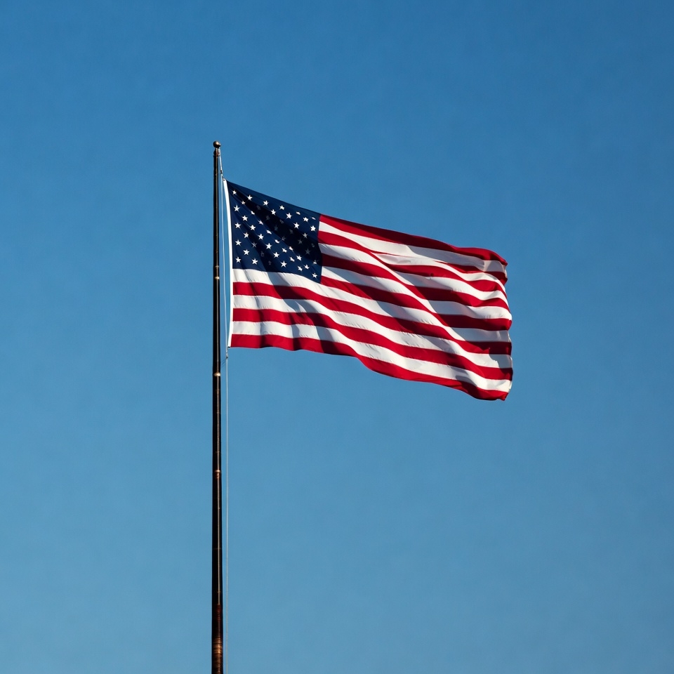USA flag, blue field, blue sky, clear sky, flag, flagpole, isolated background, patriotic, pole, red stripes, stars, stars and stripes, waving flag, white stripes, wind, American flag