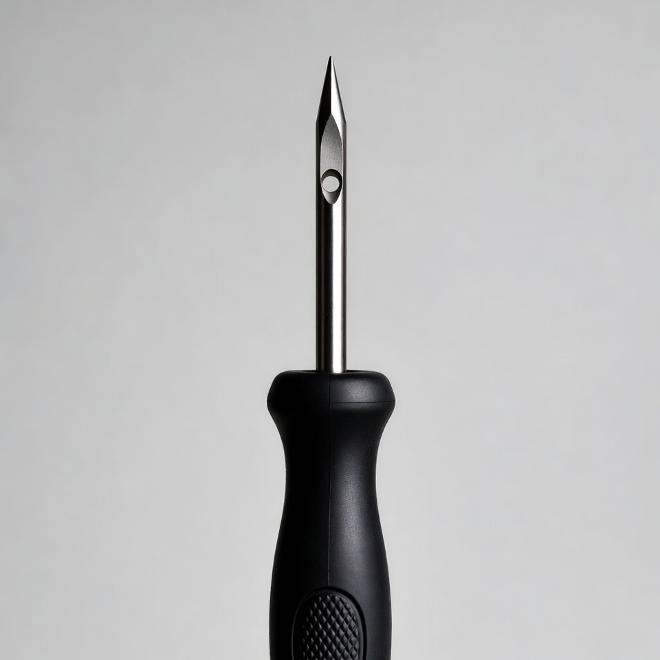 black handle, closeup, crafting tool, hand tool, isolated background, leather awl, metal tip, pointed tool, puncture tool, sewing awl, sharp awl, stitching awl, tool, awl