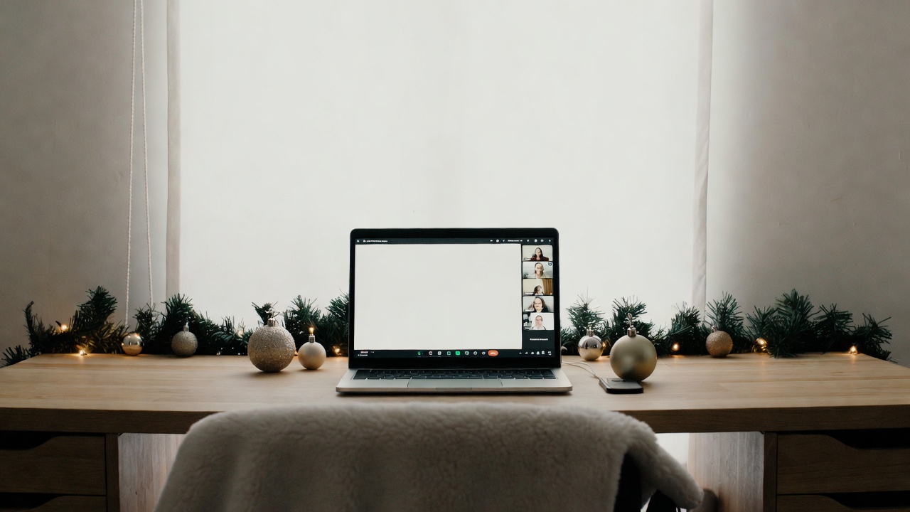 Laptop with Zoom call on Christmas desk