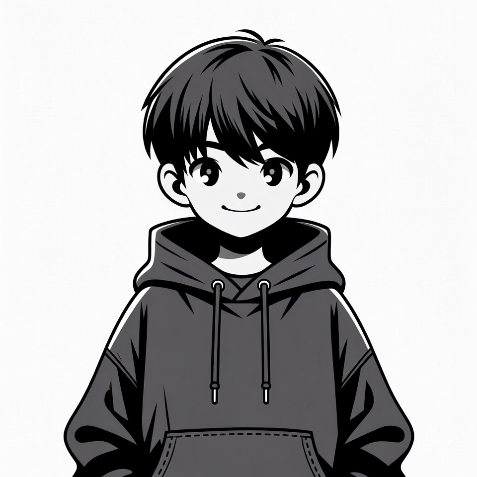 black and white, black hair, boy, chibi style, clipart, cute boy, front view, happy expression, hoodie, illustration, isolated background, large eyes, male, manga style, smiling, young boy, anime boy