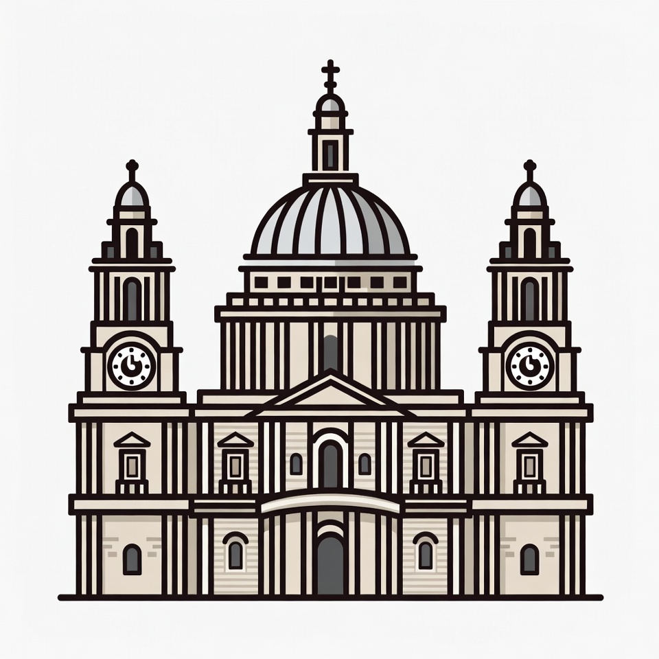 Line art illustration of St Paul's Cathedral features a large central dome flanked by twin towers with clocks. The baroque architecture includes columns, arched windows, and a cross atop the dome. It is depicted on an isolated white background.