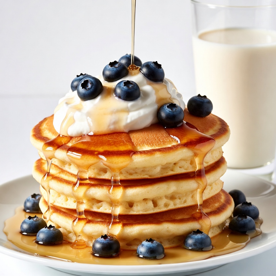 A tall stack of golden pancakes drizzled with maple syrup sits on a white plate. Fresh blueberries and a dollop of whipped cream top the pancakes. A glass of milk stands beside the plate on a white surface.