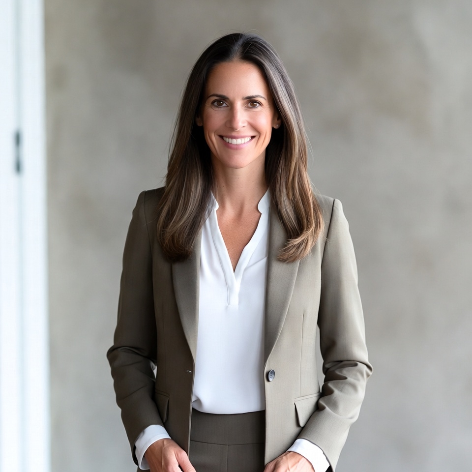 A mature woman with long brown hair smiles confidently at the camera. She wears a brown blazer over a white collared blouse and matching pants. She stands against a light gray textured background with hands clasped in front.