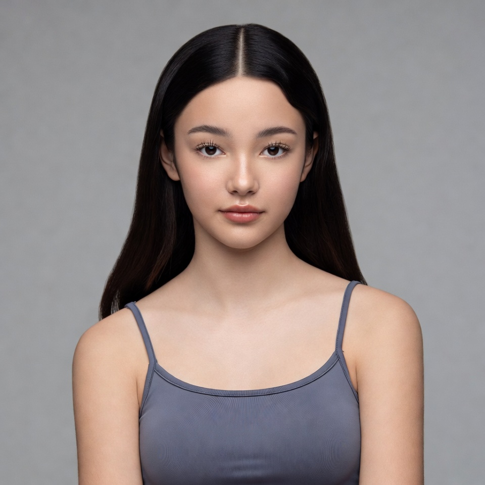 Asian, beautiful face, black hair, delicate features, female, girl, gray background, gray tank top, headshot, isolated background, long hair, neutral expression, portrait, spaghetti straps, straight hair, young woman, Asian girl