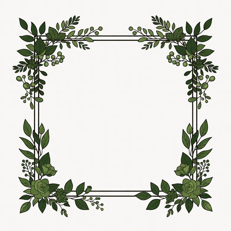 berries, botanical frame, clipart, decorative border, elegant border, floral border, foliage frame, greenery, illustration, isolated background, leaf frame, leaves, nature design, plant frame, rose frame, square frame, vector art, vines, wreath border, green frame