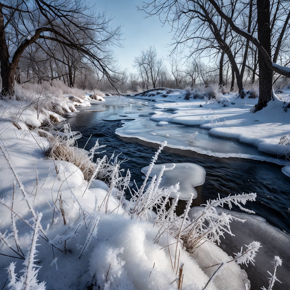 bare trees, blue sky, cold weather, frost covered, frosty branches, frozen creek, frozen water, ice patches, icy stream, nature photography, reeds grass, scenic river, snow covered, snowy banks, snowy landscape, snowy river, winter nature, winter scene, woodland winter, winter stream