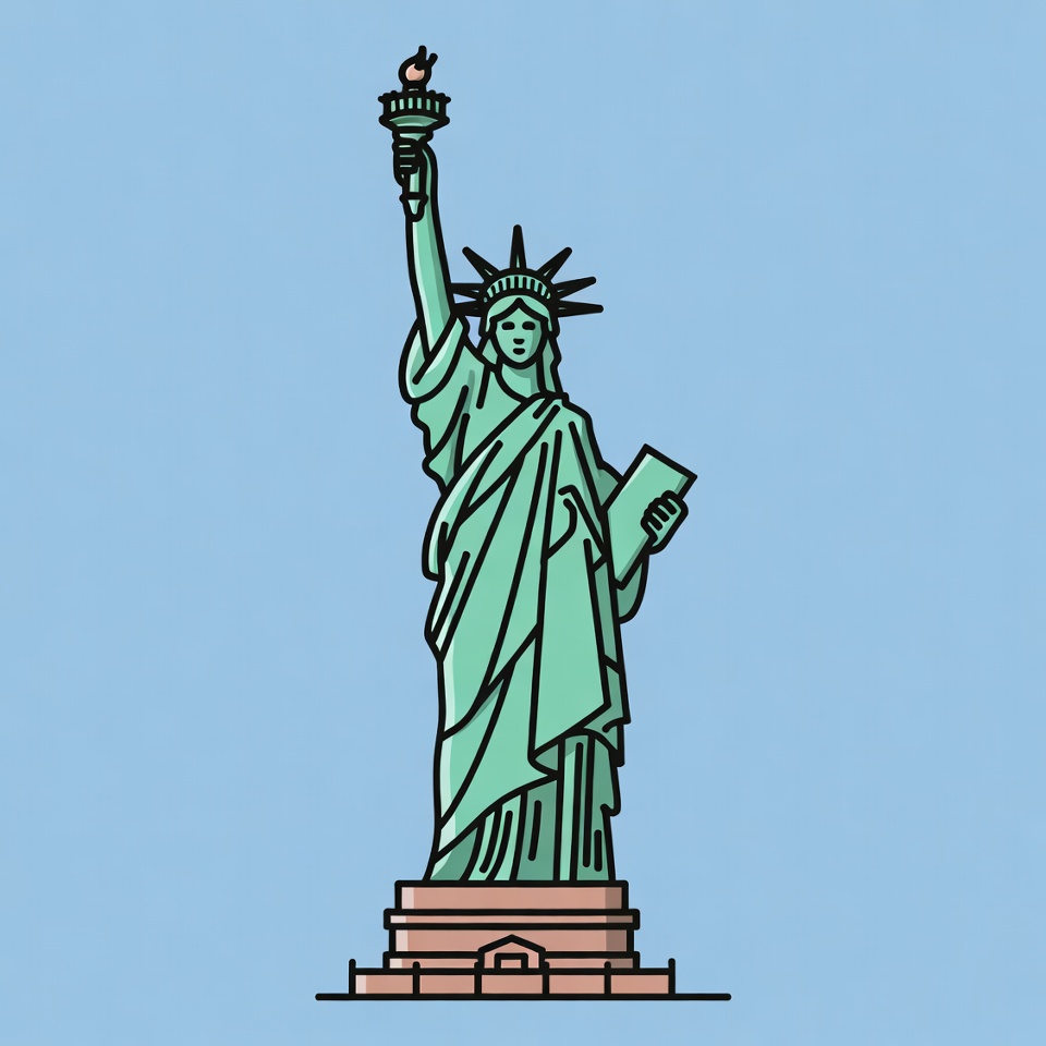 A minimalist line art illustration of the Statue of Liberty stands on a pedestal against a solid blue background. She holds a torch aloft in her right hand and a tablet in her left, wearing a flowing robe and spiked crown. The design features clean green outlines with subtle shading on the base.