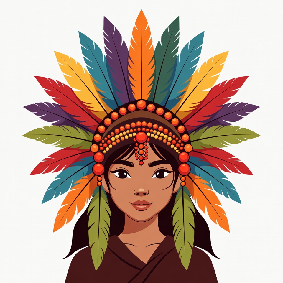 A young Indigenous woman with dark hair and smooth brown skin wears a vibrant multicolored feather headdress featuring red, purple, green, and orange feathers. She has a beaded headband with red beads around her forehead and a subtle smile on her face. The illustration is set against a plain white background.