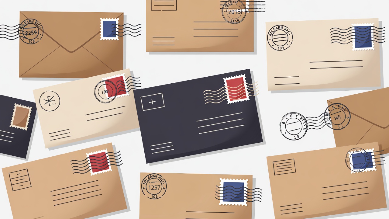 A collection of various colored envelopes, including white, brown, and black, arranged on a plain white background. Each envelope features postage stamps in red, blue, and other colors, along with address labels and postmarks. The illustration displays them scattered in an overlapping pattern.