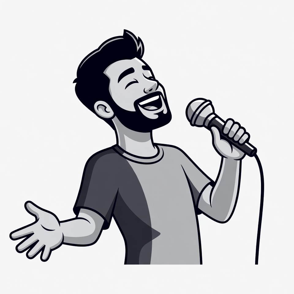 A cartoon man with short dark hair and a beard sings passionately into a handheld microphone. He wears a gray t-shirt and has one arm raised expressively. The illustration is in black and white line art style on an isolated white background.