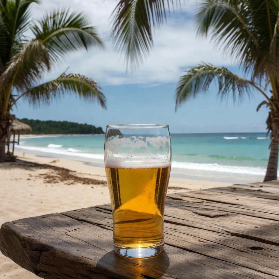 A tall glass of frothy golden beer sits on a weathered wooden table at the beach. Palm trees and turquoise ocean waves are visible in the background under a partly cloudy sky. The scene features a tropical shoreline with sandy beach and distant huts.