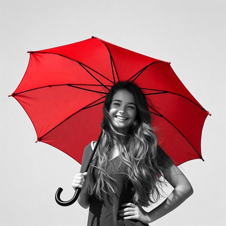 A young woman with long wavy hair smiles while holding a bright red umbrella above her head. The image is in black and white except for the vivid red umbrella. She wears a black dress and stands confidently against a white background.