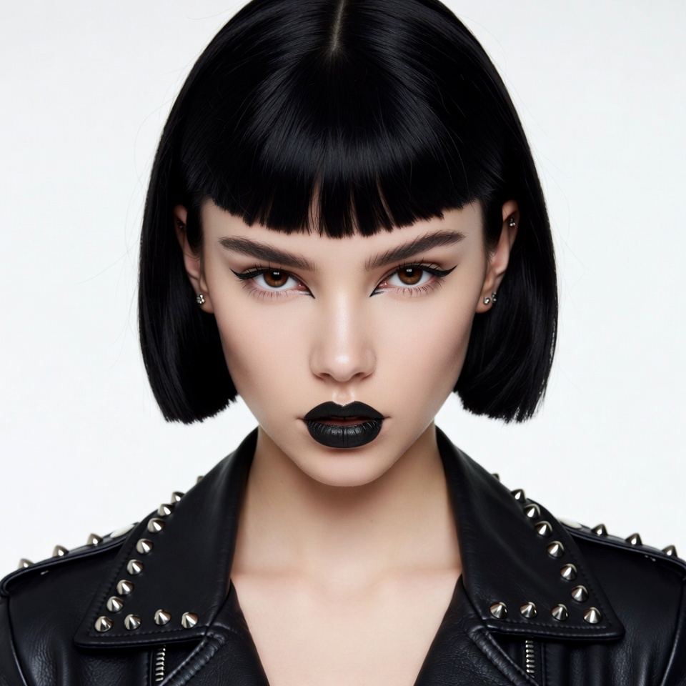 A young Asian woman with straight black bob haircut and blunt bangs stares directly at the camera. She has dramatic cat-eye makeup, deep black lipstick, and small earrings. She wears a black leather jacket with silver studs over a low-cut top, set against a white background.
