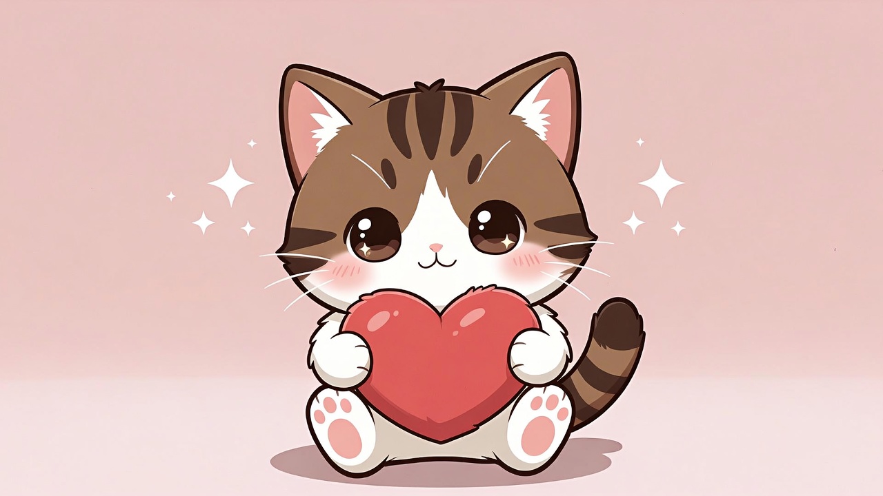 An adorable chibi-style tabby kitten with large sparkling eyes sits on a pink background, clutching a big red heart with its paws. The kitten has brown and white fur, fluffy paws, and a striped tail. Shiny stars surround the cute cat illustration.
