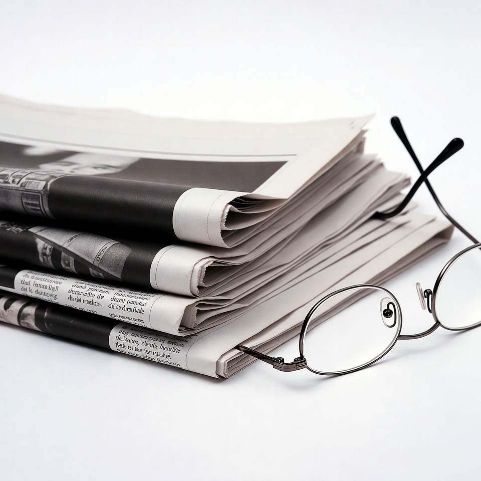 A tall stack of folded newspapers sits on a white background. Round black reading glasses rest on top of the stack. The newspapers feature black-and-white printed articles and photos.