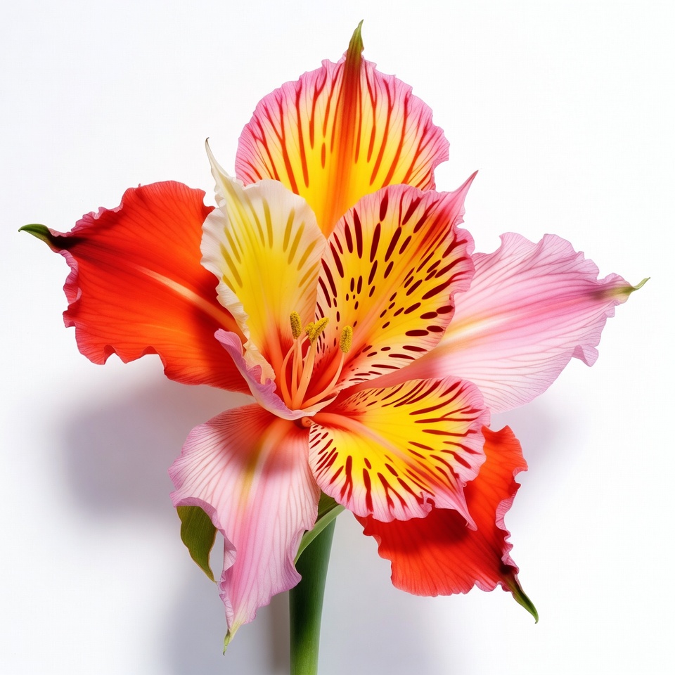 Peruvian lily, bold colors, exotic bloom, flower closeup, flower photography, green leaves, green stem, isolated background, lily, multicolored flower, pink petals, red petals, ruffled petals, striped petals, tropical flower, vibrant flower, white background, white petals, yellow petals, Alstroemeria flower