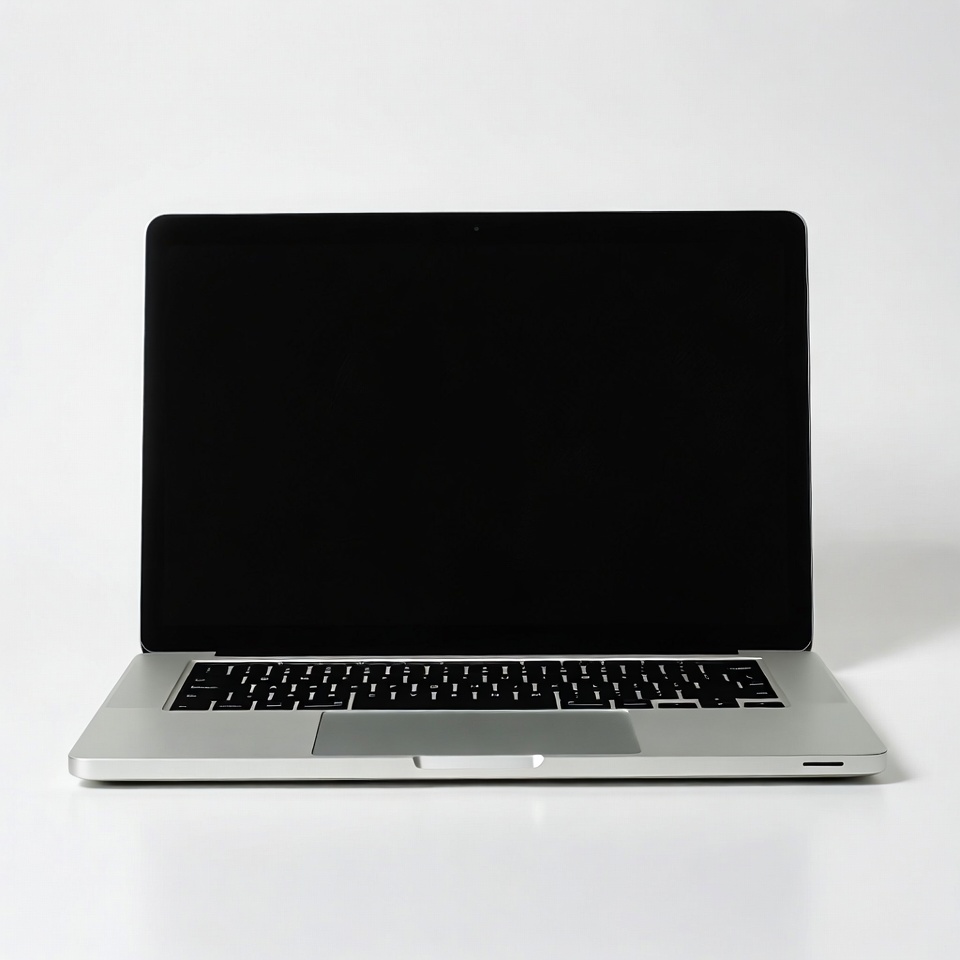 A silver MacBook Pro laptop with a black screen is centered on a plain white background. The screen is closed, showcasing the keyboard and trackpad. It is positioned straight ahead for a clean product view.