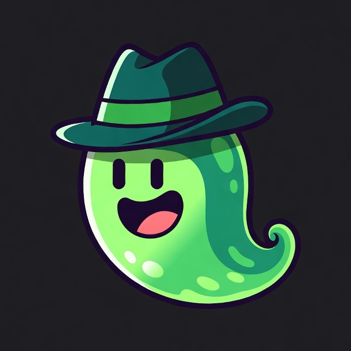 A cheerful green cartoon ghost with a wide smile floats against a black background. It wears a stylish green fedora hat tilted to one side. The ghost has glossy, translucent features and a playful expression.