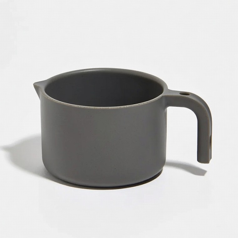 A modern gray ceramic teapot features a spout and ergonomic handle. It sits on a white surface with subtle shadows highlighting its matte finish and curved shape. The design is simple and minimalist.