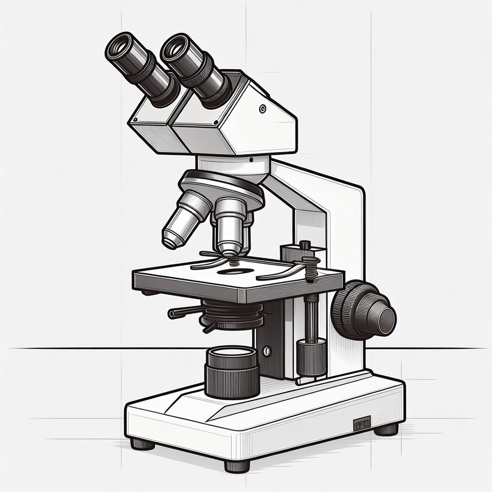 biology microscope, black and white, clipart, compound microscope, eyepieces, focus knobs, illustration, isolated background, lab tool, laboratory equipment, line drawing, microscope stage, objective lenses, research equipment, science illustration, scientific instrument, microscope