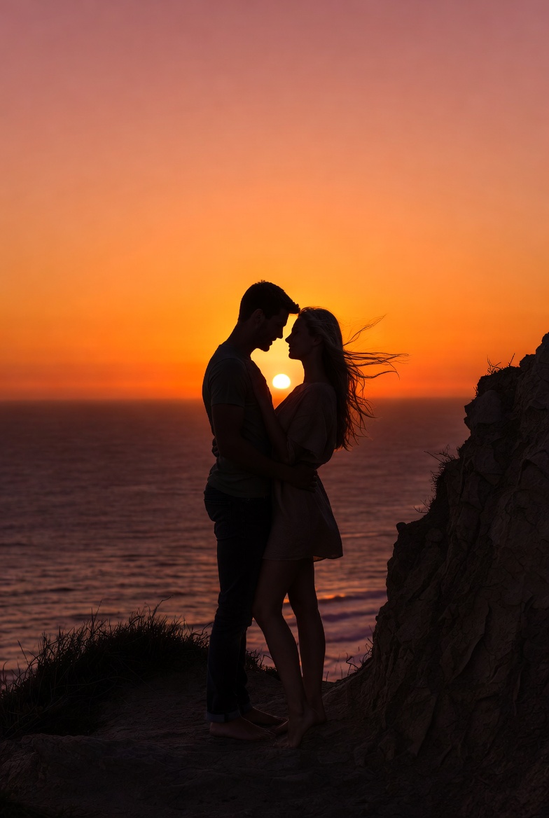 A silhouette of a man and woman stands closely together on a cliff overlooking the ocean at sunset. The vibrant orange and pink sky frames their romantic pose with the sun positioned behind them. Waves crash below against rocky cliffs with grass on the edge.