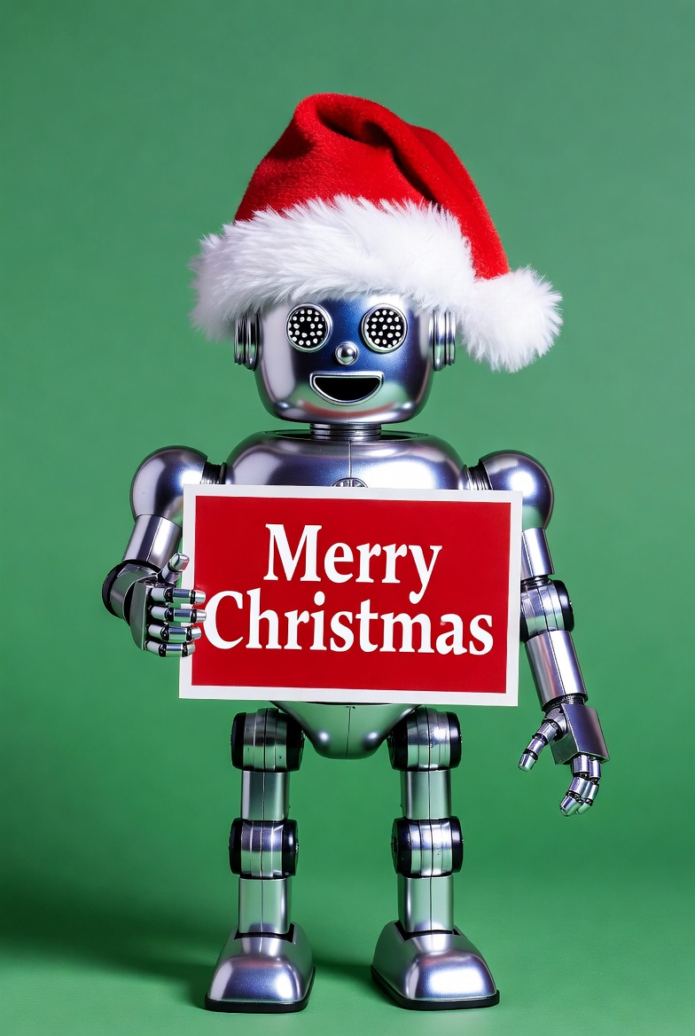 A shiny silver robot with a red Santa hat stands on a green background. It holds a red sign reading 'Merry Christmas' with both hands. The robot has blue glowing eyes and a cheerful expression.