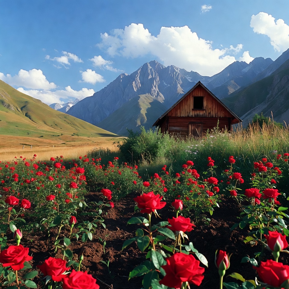 A rustic wooden cabin sits amidst a vast field of blooming red roses under a clear blue sky. Snow-capped mountains rise dramatically in the background, with green hills and scattered clouds enhancing the scenic landscape. Tall grasses and bushes surround the cabin near the vibrant rose garden.