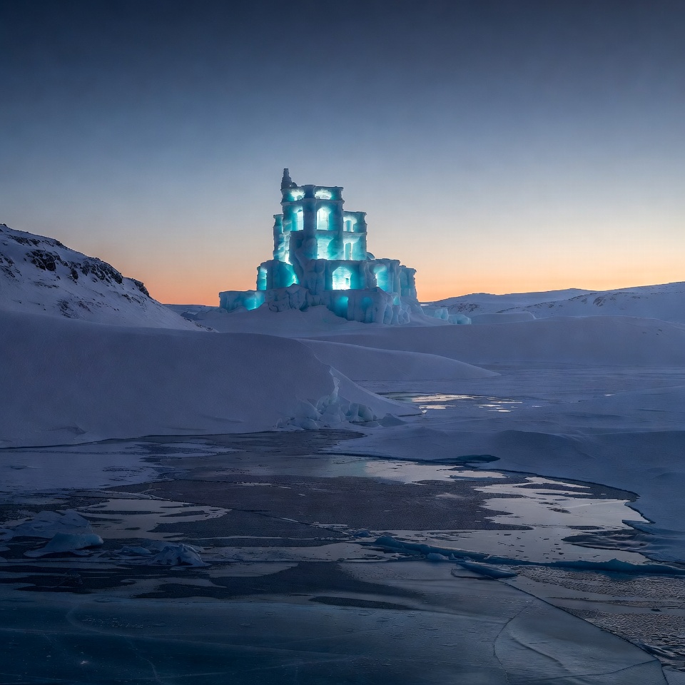 Arctic, blue glow, cold, expedition, frozen, frozen landscape, glacier, hills, ice blocks, ice sculpture, ice structure, icy towers, illuminated ice, landscape, mountains, nightfall, polar, snow, snowfield, snowy terrain, sunset, twilight, winter, ice castle