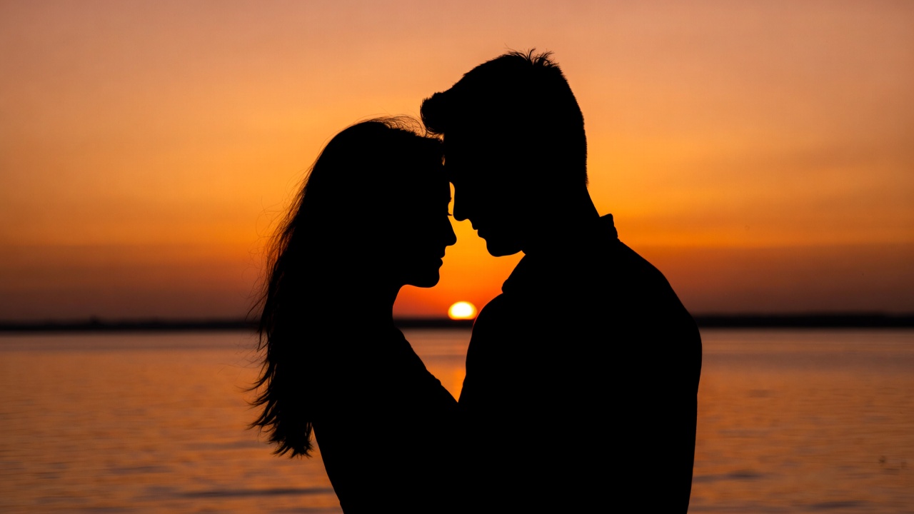 A silhouette of a man and woman stands close together facing each other against a vibrant orange sunset over a calm body of water. The woman's long hair flows down her back, and they appear to be touching foreheads intimately. The scene captures their profiles in dark outline against the glowing sky and serene lake.