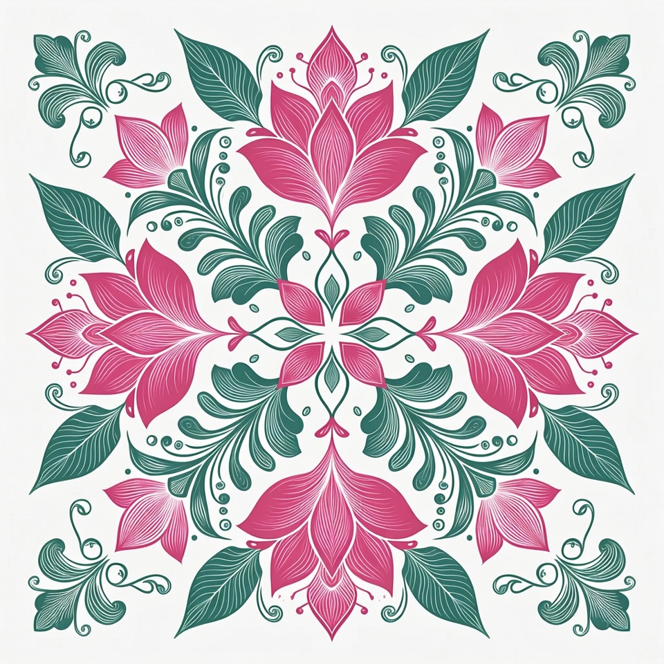 A symmetrical floral mandala illustration features vibrant pink flowers with intricate green leaves and swirling details. The design is arranged in a square pattern on a white background. Multiple blooming flowers radiate from the center with ornate line work.