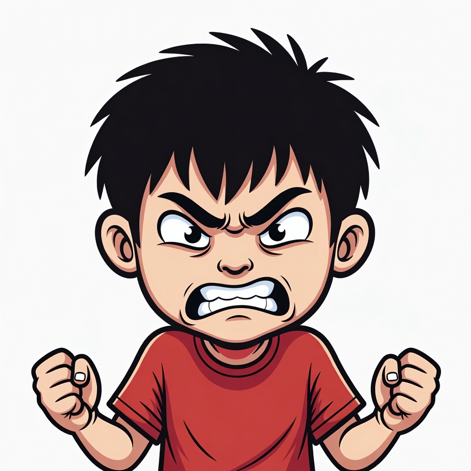 A cartoon illustration of a young boy with spiky black hair and an angry expression on a white background. He wears a red short-sleeved shirt and clenches both fists tightly in front of his chest. His eyebrows are furrowed, mouth open in a scowl, and eyes narrowed fiercely.