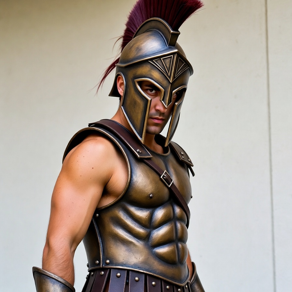 Greek soldier, Spartan helmet, White man, abs, ancient Greece, ancient armor, bronze helmet, bronze plating, chest armor, cosplay, detailed armor, fighter, greaves, helmet, historical costume, intense gaze, isolated background, leather straps, male, man in armor, muscular man, red plume, shieldless, warrior costume, warrior pose, Spartan warrior