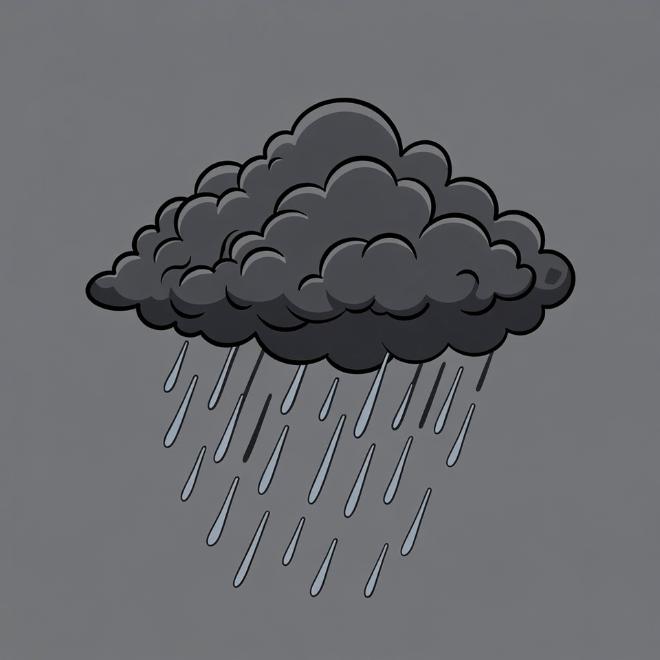 A dark gray cloud illustration with heavy rain falling from it. The cloud is outlined in black on a light gray isolated background. Simple cartoon style with bold lines and shaded areas.