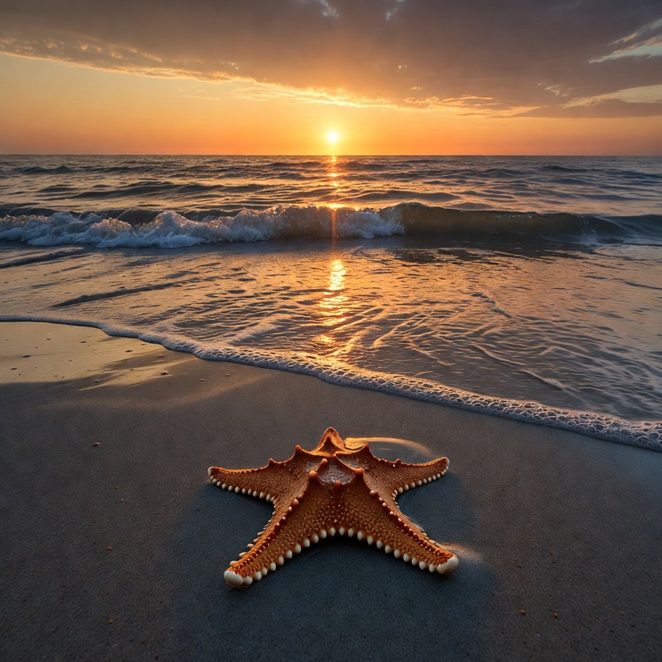A vibrant orange starfish lies on wet sand near gentle waves at sunset. The sun glows brightly on the horizon, casting warm orange and golden hues across the ocean and sky. Gentle waves reflect the sunlight, creating a serene beach scene.