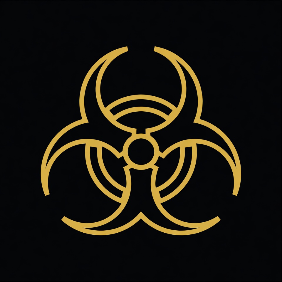 A golden biohazard symbol featuring three curved trefoils around a central circle is depicted on a solid black background. The outline design uses thick gold lines for high contrast. It is isolated with no additional elements.