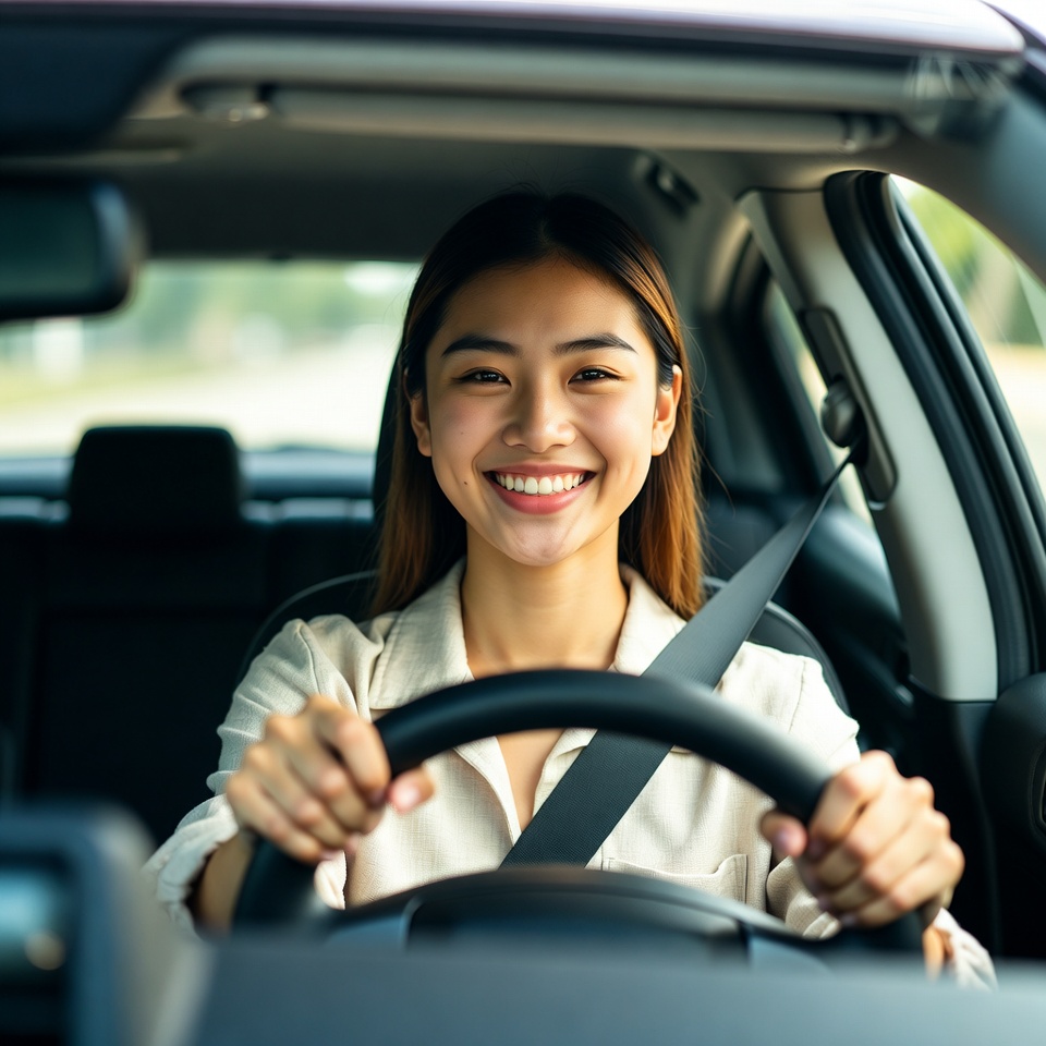 A young Asian woman with straight black hair smiles happily while driving a car. She wears a light beige blouse and seatbelt, gripping the steering wheel with both hands. The view is from inside the vehicle with greenery visible outside the windows.