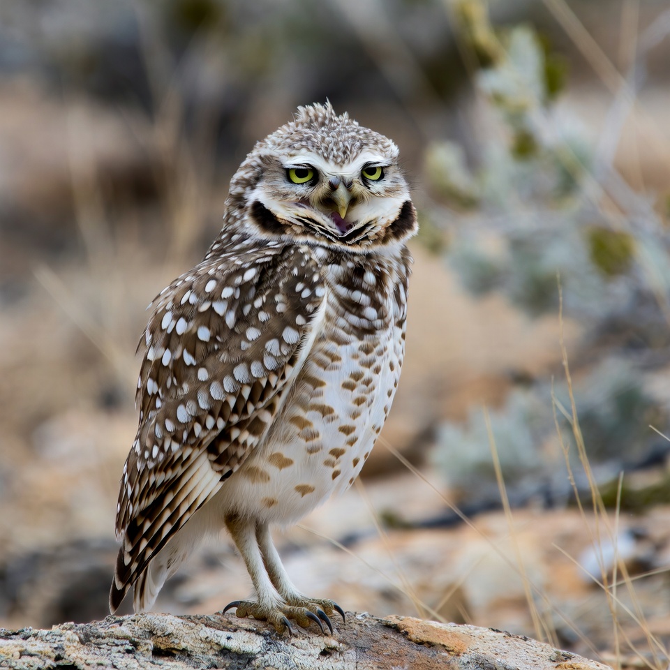 A burrowing owl with spotted brown and white feathers stands on a rock in a desert landscape. It has large yellow eyes, a small beak, and tufted feathers on its head. Blurred bushes and dry grass form the background.