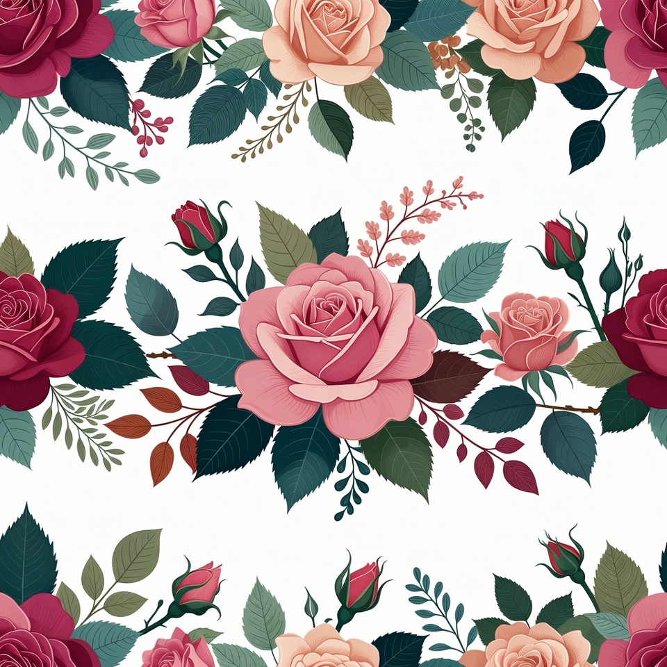 A seamless floral pattern features clusters of pink and red roses with green leaves and berries. The illustration displays varying shades from deep burgundy to soft peach roses arranged in a repeating design. Delicate stems and foliage fill the white background evenly.