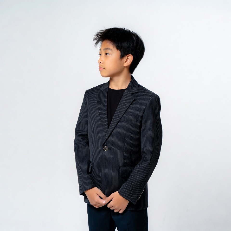 A young Asian boy with short black hair stands sideways wearing a gray pinstripe blazer, black t-shirt, and dark pants. His hands are clasped in front of him against a plain white background. He has a neutral expression and is dressed formally.