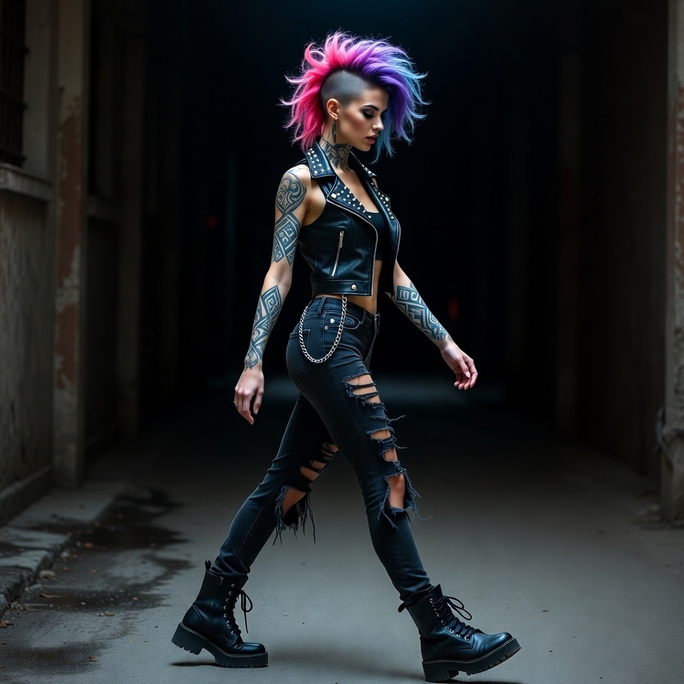 A woman with a vibrant pink and blue mohawk hairstyle walks confidently in a dark urban alley. She wears a black leather vest with studs, revealing tattoos on her arms, paired with ripped black jeans and black combat boots. Her edgy punk style is highlighted against the dimly lit brick surroundings.