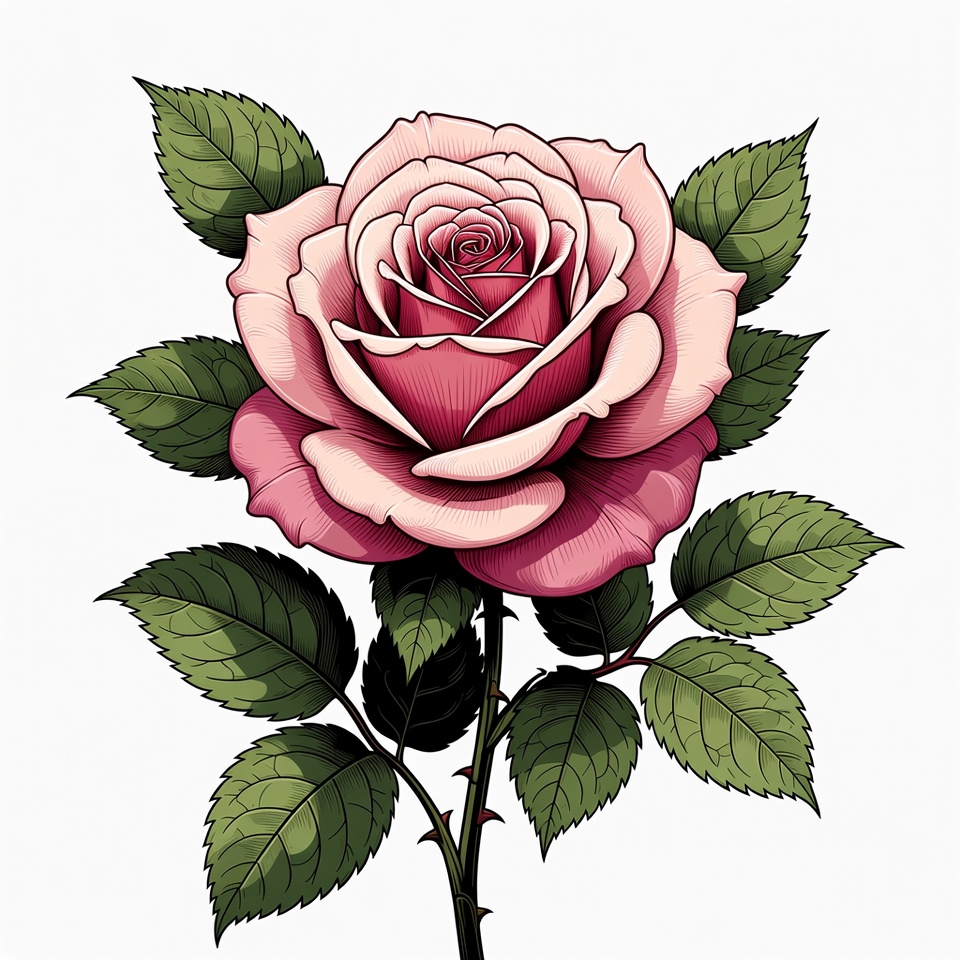 bloom, botanical drawing, clipart, floral art, flower illustration, green leaves, illustration, isolated background, nature graphic, petals, romantic flower, rose flower, rose stem, thorns, vector rose, pink rose