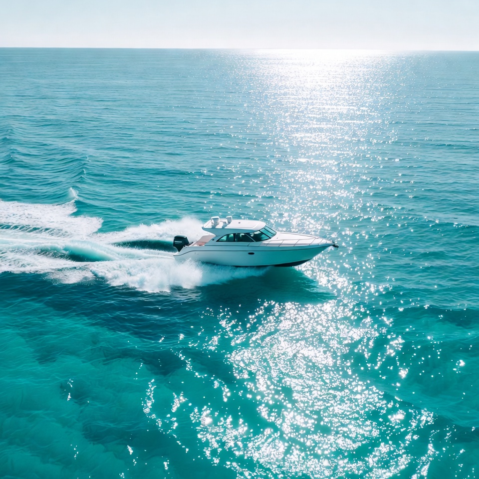 A white speedboat with a cabin cruises swiftly across a vibrant turquoise ocean under a clear blue sky. White wake trails behind the boat as it moves forward, with sunlight sparkling on the water's surface. The aerial view captures the boat in motion amid endless blue seas.
